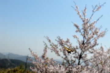 | 満開の桜の前を飛ぶキアゲハ。この姿が撮影できる日はアマチュアカメラマンには一年に一日しかありません。今日は晴れ。撮れてよかった。