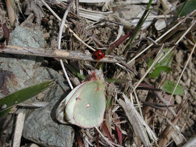 寒い日が続き、今日も気温は余り上がりませんでしたが、天気が良く日だまりは気温も上がったのでしょう、モンキチョウとテントウムシが日光浴をしていました。