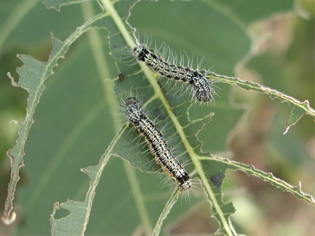 | イチヂクヒトリモドキ 幼虫再確認 吉田嘉男 2005/10/23、玉野市北方(我が家の隣の部落)で被害にあった木を見つけ、調べたところ終齢幼虫から若齢幼虫までいました(写真)。 先日、妻が綺麗な蛾が居たよと採集して冷蔵庫に保管していた種が、イチジクヒトリモドキの成虫であったことから、本日、家の近く(玉野市番田)のイチジクを調べて歩いたところ、4カ所の木から3カ所で幼虫が見つかりました。 幸い我が家の木ではまだ見つかりませんでしたが、やってくることは時間の問題でしょう!。倉敷市早島では最近イチジクの葉を食べる虫が居ると友人が話していました。何処から来たのか?今後の分布拡大が気になります。 |