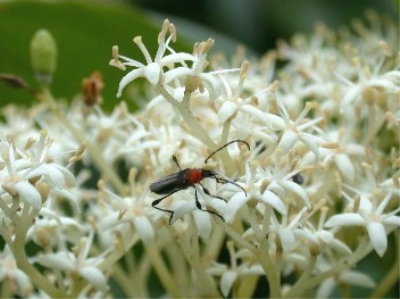 クマノミズキに訪花中のクビアカモモブトホソカミキリ 本種は単為生殖で有名 2002年6月17日 高梁市臥牛山 中野一成 撮影 |